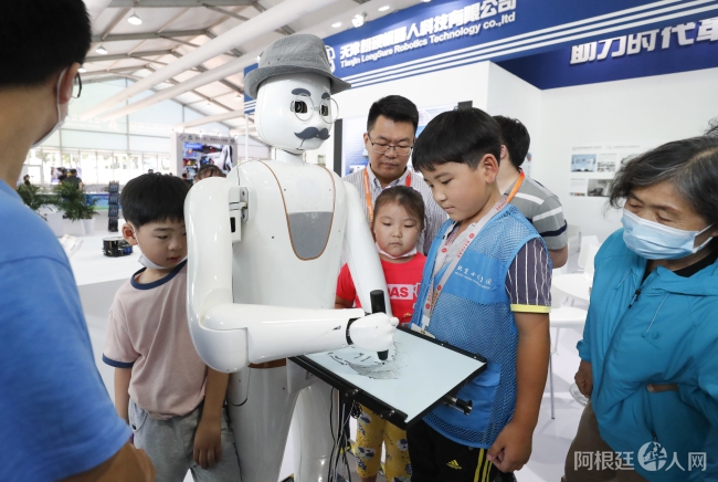 9月5日,北京,在2020年服贸会展区,深圳一家公司现场展示的画像机器人吸引参观者。这款机器人能够实时手绘人像。中新社记者杜洋摄 【南美侨报网特约记者林飞9月5日报道】...