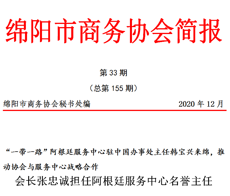2020年12月15——18日,“一带一路”阿根廷服务中心驻中国办事处主任韩宝兴专程来绵,就“一带一路”阿根廷服务中心驻四川办事处与绵阳市商务协会、外贸分会的战略合作、机构...