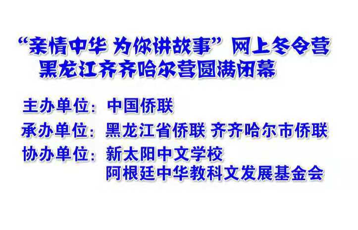 阿根廷“亲情中华•为你讲故事” 网上冬令营黑龙江齐齐哈尔营圆满闭营 新太阳教育 • 2020-12-31 21:18• 收藏本文 转载本网稿件,原则上需要书面授权,不得篡改稿件主题。本网随时有权要求第三方停止侵权行为。 本网所载内容或图片,若涉及侵权,请联系删除。 31 ___________ 2020/12 阿根廷“亲情中华•为你讲故事” 网上冬令营黑龙江齐齐 12月31日,由中国侨联主办,黑龙江省侨联、齐齐哈尔市侨联承办、新太阳中文学校-阿根廷中华教科文发展基金会协办的2020“亲情中华•为你讲故事”网上冬令营黑龙江齐齐哈尔营圆... [ 微信长按识别二维码或扫码查看分享内容 ]