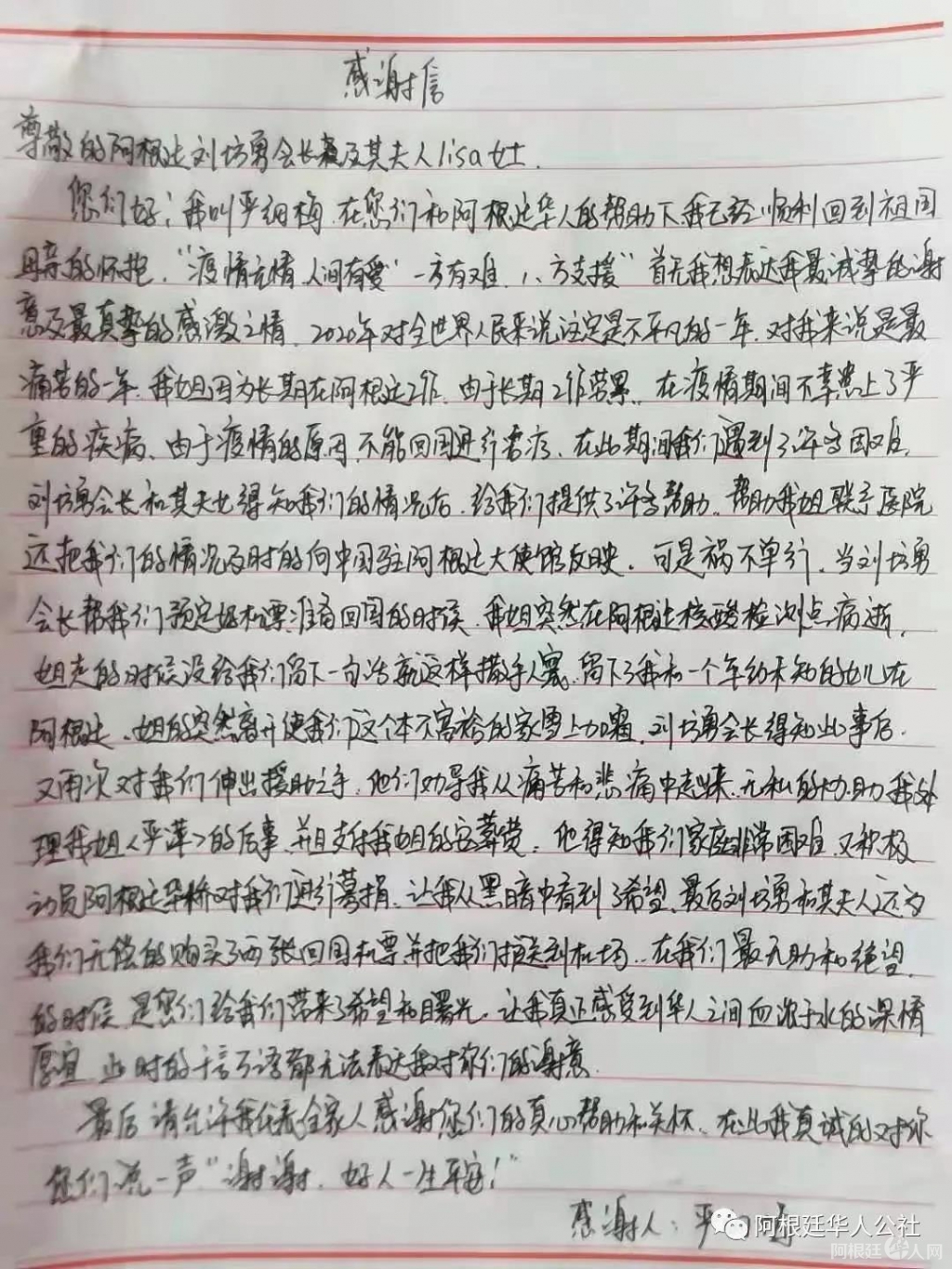 尊敬的阿根廷刘芳勇会长及其夫人lisa女士 您们好、我叫严细梅,在您们和阿根廷华人的帮助下,我已经顺利的回到祖国母亲的怀抱。“疫情无情,人间有爱”“一方有难,八方...