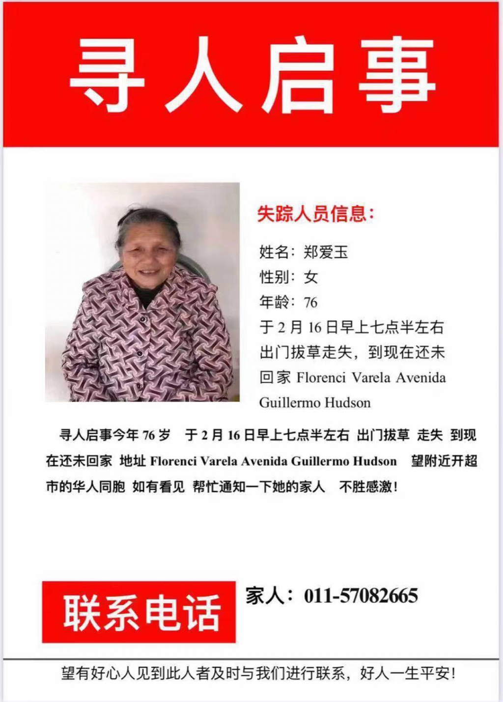 紧急寻人:一位76岁老奶奶走失.望广大同胞帮忙寻找 阿根廷华人义工团队 • 2021-02-16 17:10• 收藏本文 转载本网稿件,原则上需要书面授权,不得篡改稿件主题。本网随时有权要求第三方停止侵权行为。 本网所载内容或图片,若涉及侵权,请联系删除。 16 ___________ 2021/02 紧急寻人:一位76岁老奶奶走失.望广大同胞帮忙寻找 寻人启事 郑爱玉 今年76岁 于2月16日早上七点半左右出门拔草走失,到现在还未回家。出门时带个花色斗笠推着超市购物车,穿粉色白点上衣黑裤子。地址Florenci Vare... [ 微信长按识别二维码或扫码查看分享内容 ]