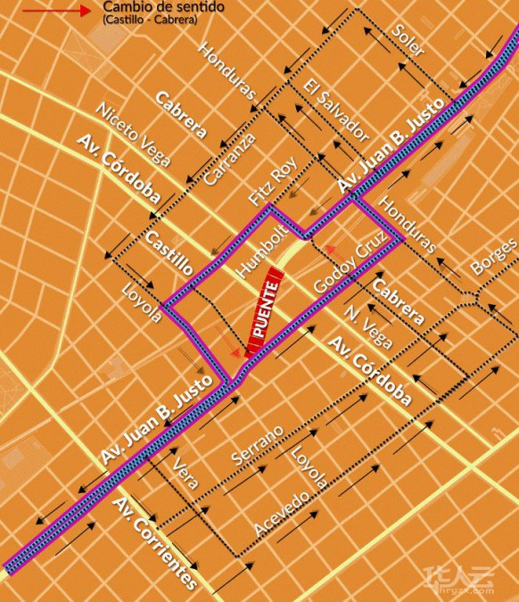 往西南方向:Av. Juan B. Justo,右转到 Soler, El Salvador, Honduras 或Cabrera; 往 Fitz Roy 或 Carranza行驶后重新回到Juan B. Justo大街。