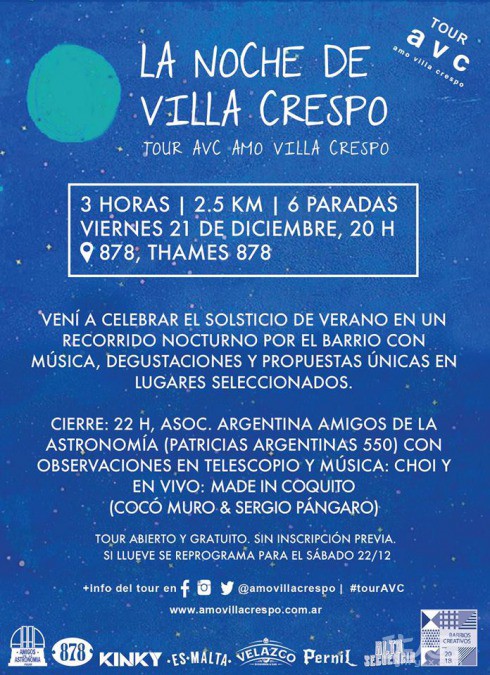 在圣诞节到来前夕,Amo Villa Crespo将在barrio附近举行夜间自行车骑行。为庆祝南半球夏至这一天,同时这也是一年中最长的一天,自行车之旅将从年轻人最喜欢的Bar 878(878酒吧)开始,然后在其他许多像Kinky Bar和Velazco Disqueria这样的Villa Crespo酒吧停一停。