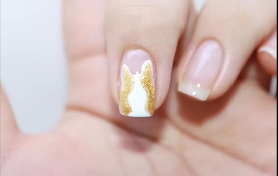 第一步:准备好所需的甲油和工具,刷上底油,照灯60秒。用勾线笔蘸白色甲油在中指前缘画出狗的形状,照灯60秒,再蘸取金色珠光甲油在两边画出狗的颜色,照灯60秒,如图。