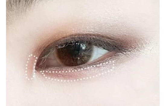 第三步:用锥形刷沾取浅玫瑰金色珠光眼影在眼头和下眼睑的虚线范围内提亮。