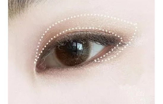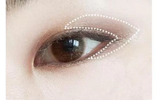 第一步:用眼影刷沾取卡其色眼影在图中的虚线范围内做基础的打底。