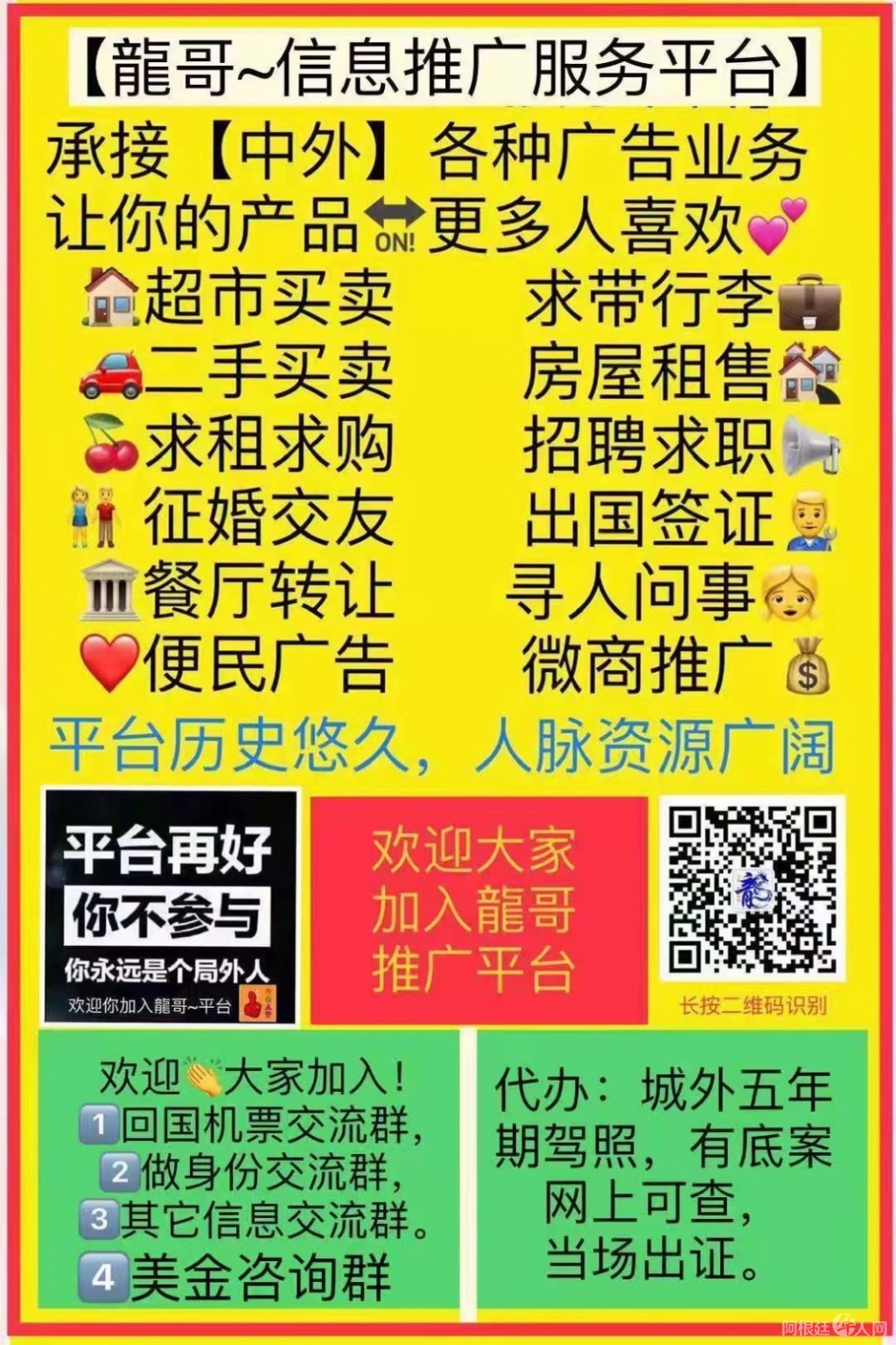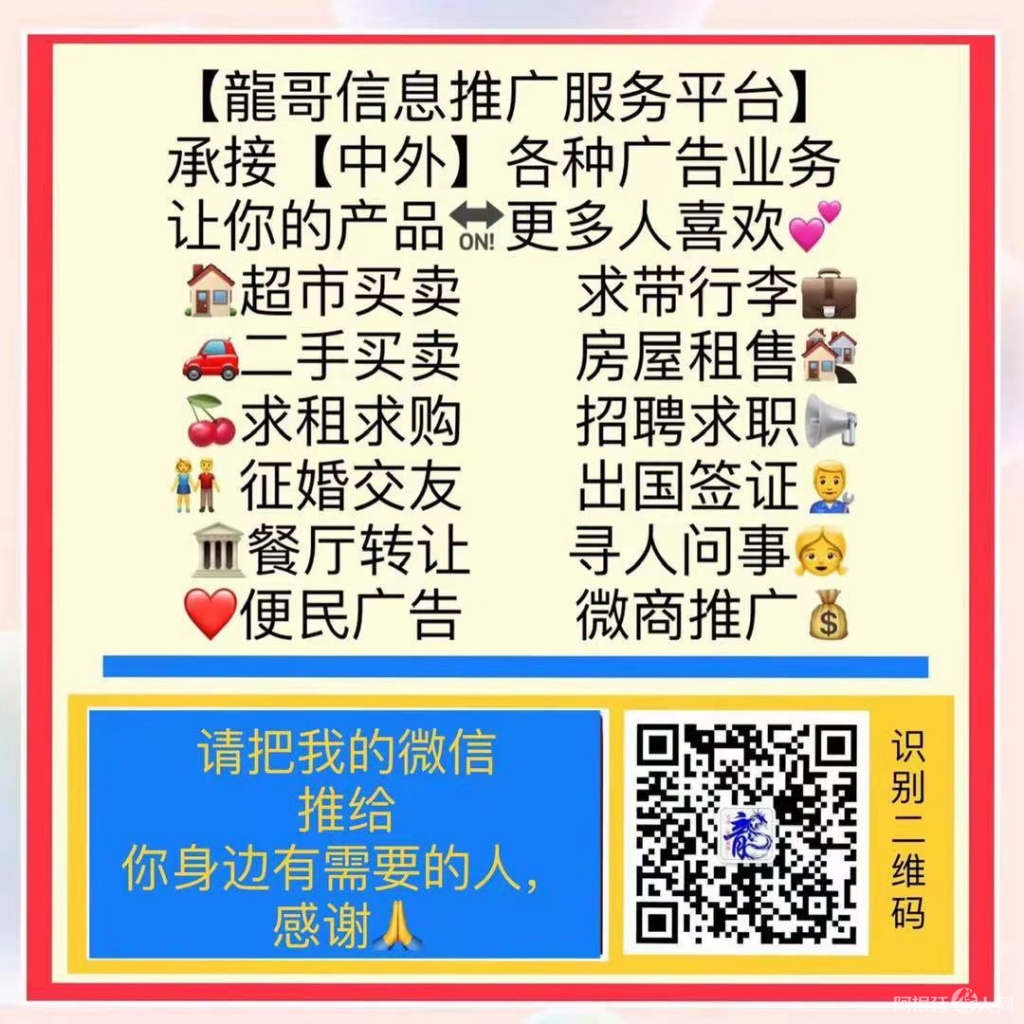 龙哥信息推广服务平台承接【中外】各种广告业务让你的产品需更多人喜欢 超市买卖求带行李二手买卖、房屋租售求租求购、招聘求职征婚交友、出国签证血餐厅转、寻人问事便民广告、微商推...