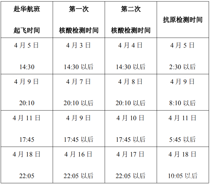 自2022年3月28日起,已接种人员在赴华航班起飞前48小时内应在两个不同的检测机构各进行1次核酸检测,其中第2次核酸检测时间为赴华航班计划起飞时间前24小时内,同时还须在赴华航班计划起飞时间前12小时内进行一次抗原检测(共计2次核酸和1次抗原,以下简称“双核酸+抗原”)。