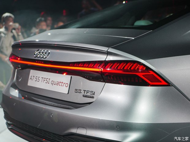 车尾部分,新车的整体比例宽大而扁平,营造了低趴的视觉效果,看上去非常动感。尾灯是新A7 Sportback的一大亮点,虽然与奥迪新A8同为贯穿式设计,但灯组内部26颗竖向和1根横向的OLED灯带,配以两侧扩散的形状,使其看上去比新A8更显夸张。此外,新车还将提供15种基础车身颜色供选,而客户也可以选择自行定制漆面。