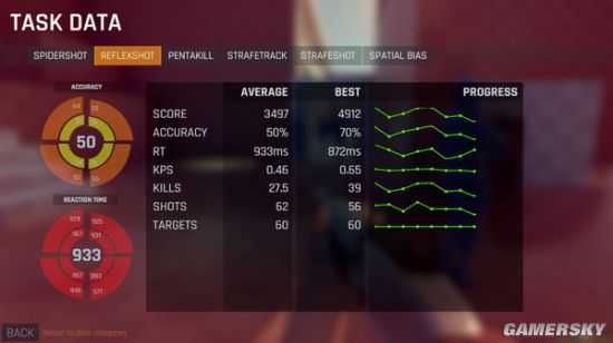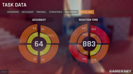 在《目标实验室》中,玩家可以在不同场景下使用不同武器与ai进行训练,游戏会对玩家的表现进行实时跟踪和分析,然后对玩家的表现进行点评,并列出策略指导。项目包括速度、准确度、精准度、反应速度、视觉敏锐度、决策速度、适应性和视觉注意力,几乎囊括了一切FPS需要的基础能力。