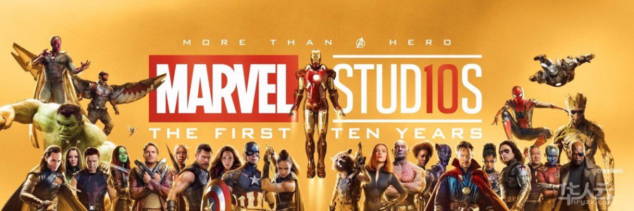 漫威电影宇宙迎来10周年,电影中的超级英雄们同框拍大合照,画面壮观。