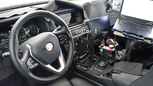 从最新曝光的谍照来看,全新Cullinan的内饰采用了劳斯莱斯家族式的设计,新车将配备一个液晶仪表盘,同时还将配有一个大尺寸的中控屏。值得一提的是,目前新车正在测试状态,所以装配的是一个宝马的多功能方向盘。