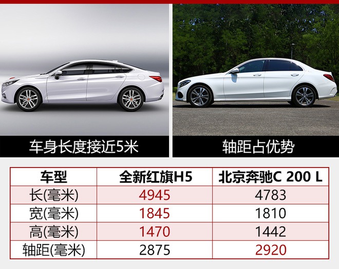 从数据上看,与以14,920辆获得1月豪华轿车市场销售冠军的奔驰C级(以C 200 L为例)相比,全新红旗H5除轴距之外全面超越奔驰C级。尤其是4,945毫米的车身长度可与合资品牌更高级别轿车媲美。