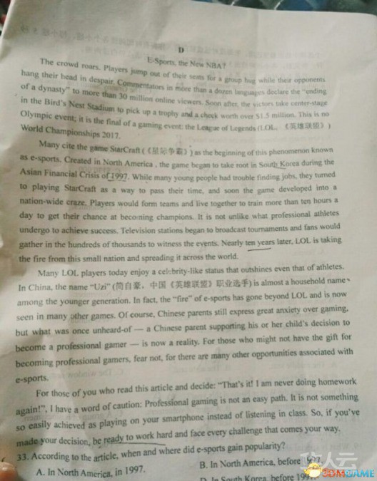 近几年电子竞技被教育部纳入了高校专业,网上也频频曝光某高校电竞专业试卷、父亲晒儿子电竞考试高分试卷等的热门新闻。令人吃惊的是,《英雄联盟》及知名选手Uzi也现身于高中全国卷英语阅读理解试卷中。
