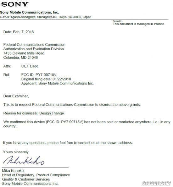 XB称索尼在2月7日向美国FCC(联邦通信委员会)提交了一份文件称,由于设计方面的重大调整,要求移除关于PY7-00718V的所有相关权利文件。