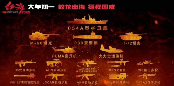 全真武器和装备呈现的效果更是显得很不一样的。《红海行动》制作总成本达5亿元人民币预算;军事装备预算达2亿元人民币,中国军方为《红海行动》提供了大量的支持,最多时曾动用六艘军舰一起出海,再用直升机去航拍。其中出镜的“临沂舰”是刚入列的一艘新舰,中国建造的第13艘054A型导弹护卫舰,在完成航行测试后,临沂号导弹护卫舰在2012年12月22日正式编入中国人民解放军海军北海舰队,造价14亿。