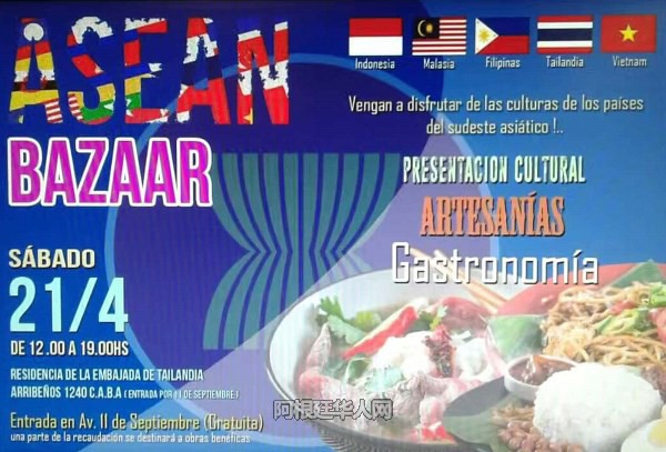 本周六(4月21日)将在泰国驻阿使馆附近举行,由印度尼西亚,马来西亚,菲律宾,泰国,越南等国家奉献的美食盛宴。届时还将进行各国文化展示及ASEAN义卖活动,所出售的商品和工艺品收入将捐献给慈善事业。