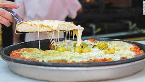 足足一英寸(约2.54厘米)厚的面包皮上点缀着些许番茄酱、绿橄榄和辣椒粉,下面则是是充满阿根廷特色的马苏里拉奶酪,用量毫不吝啬,浓厚的奶酪在高温下融化,顺着面包皮边缘缓缓流淌。