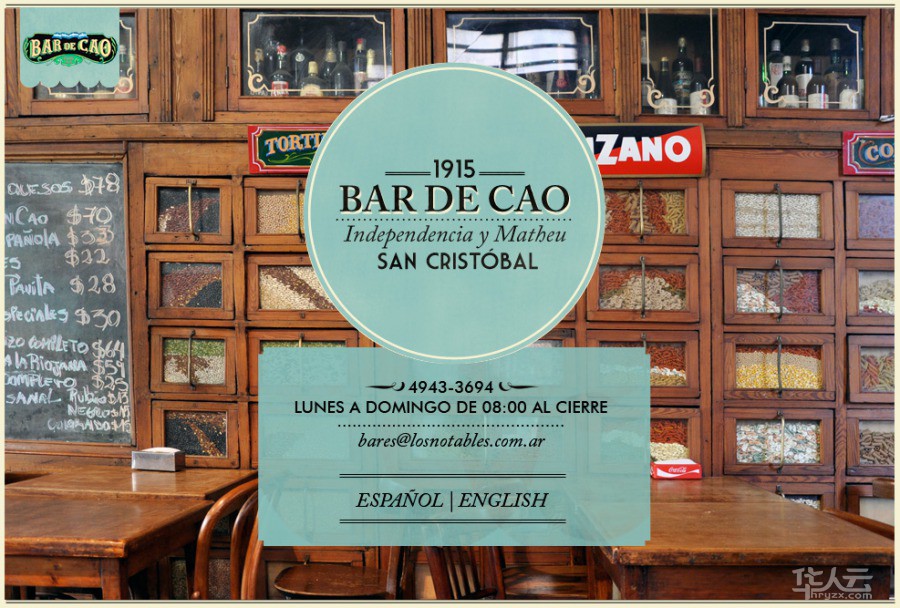 BAR DE CAO原本是一间由两兄弟经营的杂货店,主要售卖酒类饮品和香肠等日常小货品,直到1930年改成酒馆。传统小酒馆是阿根廷人日常生活中的重要部分,是朋友聚会、独自休闲和消遣的好地方。70多年来这间街角的小酒馆接待过城中众多的名流贵族。也许正由于它的历史积淀,现在的BAR DE CAO更加生机勃勃,散发着不可阻挡的青春活力。