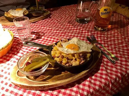 这里的食物也和装饰一样不求精致,却绝对能让你饱腹。如果你一时不知如何下单,不妨先点一份小薄饼试味,若问题不大,再继续品尝这里特色的鲑鱼汤、烤猪排、鹿肉、芬兰啤酒等。