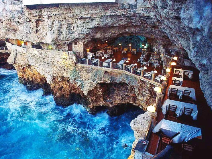 洞穴餐厅是Grotta Palazzese酒店的一部分,只在每年5月至10月的夏季开放,餐厅位于高24米的岬角溶洞内,洞外是蓝色的亚得里亚海,拂面的海风,轻拍的海浪,着实令人神清气爽。