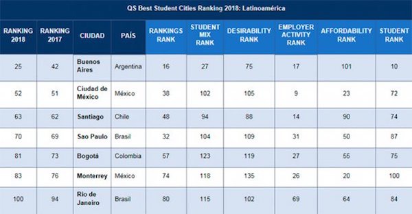 据了解,布宜诺斯艾利斯在排名中的上升主要得益于其在学生视角上的改善,该指标在此次调查中收到了超过5万份来自学生的回复。其中要求高校学生对其在一个特定城市中的体验进行打分,同时看是否在毕业后会留在当地。在这个指标上,布市排名全球第10名。