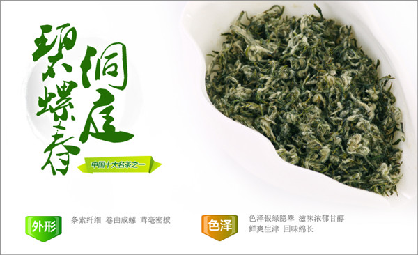 碧螺春乃茶中珍品,以"形美、色艳、香高、味醇"闻名中外。唐陆羽<茶经>"茶之出"中曾提到:"苏州长州生洞庭山"。据<随见录>载:"洞庭山有茶,微似芥茶而细,味甚甘香,俗呼为'吓煞人',产碧螺峰者尤佳,名碧螺春"。又有说是清康熙帝因嫌"吓煞人"不雅,改名为"碧螺春",并列为贡品。又据清未震钧所著<茶说>载:"茶以碧萝(螺)春为上,不易得,则苏之天池,次则龙井;岕茶稍粗......次六安之青者。