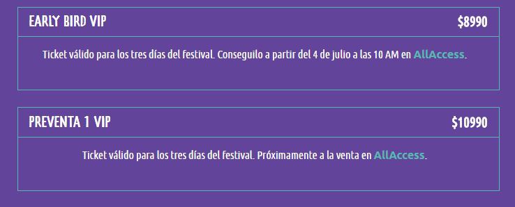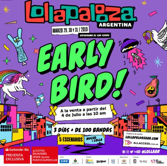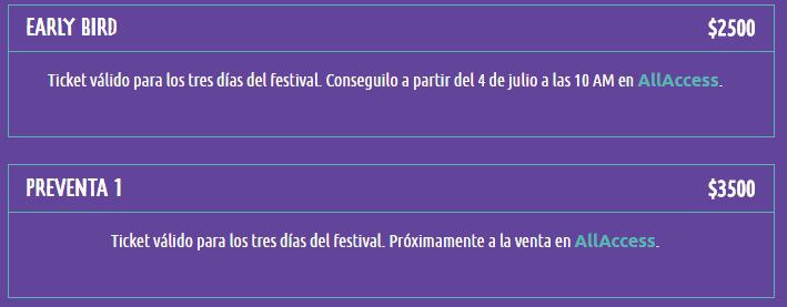2019年门票将在7月4号早上10点提前开卖。可在ALLACCESS网上订购或在售票站购买。需要注意的是7月4号到10号只限拥有SANTANDER RIO银行卡者才能在网上订购,没有银行卡的只能等到卖出票数到达4万张或7月10号后才能购买(通常一天后或同一天下午即可购买)。如果是在售票处购买,接受现金支付或者银行卡。4号唯一的售票处是 La Rural (Av. Santa Fe 4201 ).5号起其他售票处也将开卖地址为Open 25 (Av. Corrientes 902) 和 eatro Vorterix (Av. Federico Lacroze 3455)