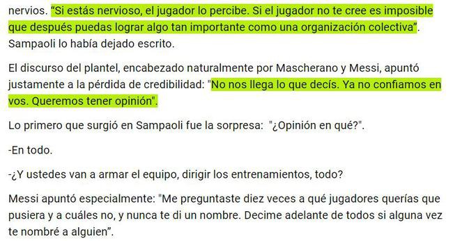 马斯切拉诺和梅西带头向桑保利发难,梅西甚至表示:“我们不知道你的想法是什么,我们不再信任你了,我们想要有自己的观点。”