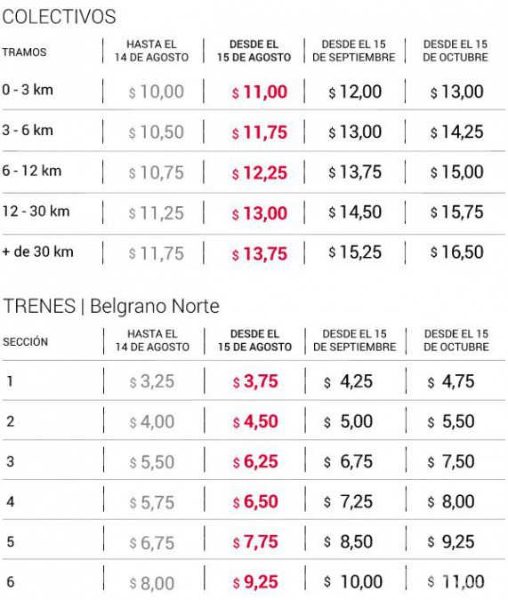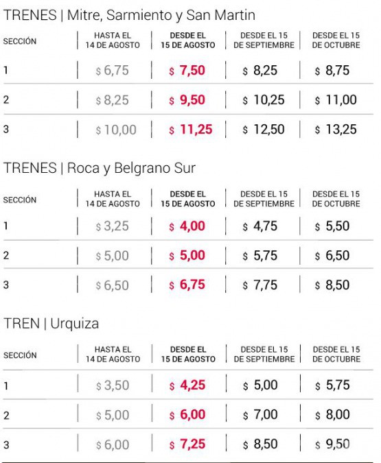 在火车票价方面,San Martín、Sarmiento及Mitre线的票价将在8到10月间分别涨价0.75、0.75及0.5比索。即最低票价将从6.75比索涨至8.75比索,最高票价将从10比索涨至12比索,涨幅在29%到32%。Belgrano Sur线、Roca线、Urquiza线及Belgrano Norte线的火车票也有不同程度的调涨。