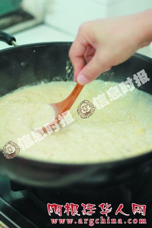 5 土豆泥和牛奶煮匀,搅拌成泥状后,即可熄火。
