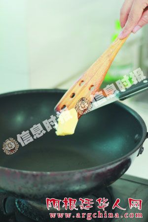 2 锅加热后放入牛油和蒜蓉爆香。在蒜蓉变黑前加入3碗水烧开。