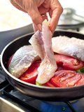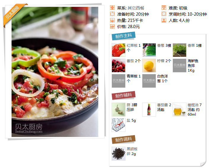 - 4、 番茄酱翻炒均匀后,把一半的洋葱片、青红菜椒圈、番茄片码放入锅中,用这些蔬菜把锅底铺满。把腌渍好的鱼排从冰箱中取出,码在蔬菜上面。再把余下的一半洋葱片、青红菜椒圈和番茄片码在鱼片上面,最后在上面撒上番茄碎,锅中淋入2汤匙橄榄油、调入3g盐,可以根据个人喜好撒上黑胡椒碎。将火转成小火,加盖,慢慢加热15分钟至鱼成熟。