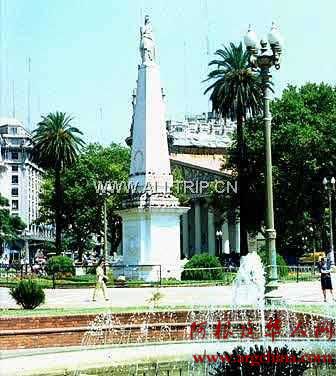在世人称为“南美巴黎”的布宜诺斯艾利斯,著名的五月广场以它特有的魅力吸引着众多的国内外游客。五月广场是布宜诺斯艾利斯的心脏。广场中心矗立着13 米高的金字塔尖型纪念碑,是为纪念在1810年五月革命中献身的爱国志士而修建的。1815年5 月25 日揭幕时,在纪念碑前通过了拉普拉塔联合省(即阿根廷的前身)独立规约。1816 年7 月9 日在这里宣布了拉普拉塔联合省《独立宣言》。最初,这座纪念碑的基座是两层的,碑顶装饰着花瓶。1856 年,阿根廷著名画家、建筑师普利里蒂阿诺·普列伊顿加以改建,塔尖上竖起一座自由女神塑像。纪念碑四周有绿茸平整的草坪、四季怒放的花卉、清澈晶莹的喷泉和往来啄食的群鸽。