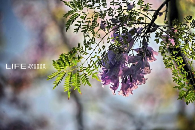 【蓝花楹 】蓝花楹是落叶乔木。树冠高大,高12~15米,最高可达20米。二回羽状复叶对生,叶大,羽片通常在15对以上,每一羽片有小叶10~24对,羽状,着生紧密。小叶长椭圆形,长约1cm,全缘,先端锐尖,略被微柔毛。圆锥花序顶生或腋生,花钟形,花冠二唇形5裂,长约5cm,蓝紫色,二强雄蕊。(资料来自网络综合)