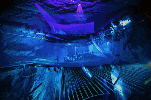 这里有三张巨型的蹦床被固定在岩壁之上,在周围一圈设计有3米高的网墙,用18米长的滑绳连接着。山洞中还设计着迷幻的灯光,照射在岩壁上,身临其境的空间感给你很多想象,不同的灯光色调伴随着跳动的改变来刺激着你的肾上腺素。在这里,体验难以置信的穿越,穿越回儿时不知天高地厚的疯狂瞬间吧~
