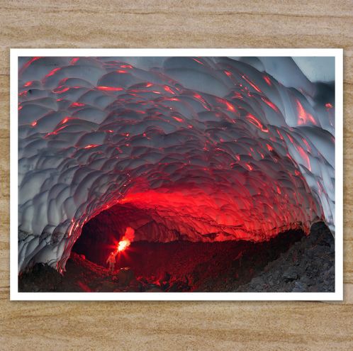 冰洞位于俄罗斯北部的穆特洛夫斯基火山附近,经常被厚厚的冰雪所包围,完美诠释了冰与火之歌,且冰火和谐的共处着。其冰洞总长度约300米,像一条长长的空间隧道,地面是零散的碎石和流淌的溪流,而顶部和两边则完全是冰块。阳光透过冰块照射入洞中,呈现出五颜六色的光芒,十分美丽迷人。