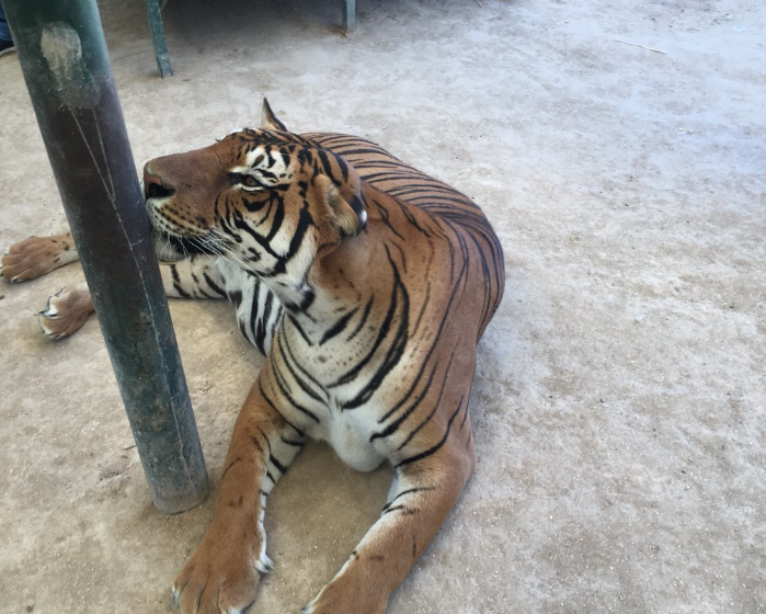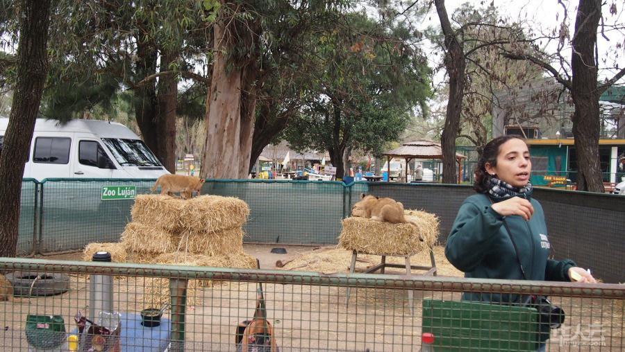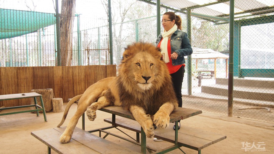 往前走是狮子园和老虎园。狮子园里有两道铁栅栏,进了第一层先把自己的包和东西放下,进了第二个园就是和狮子亲密接触了。里面一般有三只狮子,两个工作人员。他们看见游客都懒得搭理,该睡觉睡觉,该吃肉吃肉,像温顺的大猫咪。主咖一般是公狮子,其次是两只母狮子。可以摸它的毛,也可以喂它喝牛奶。