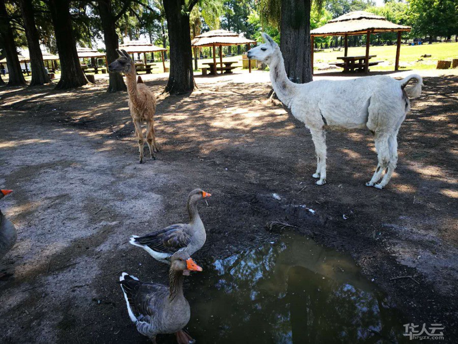 对面的草地上是一堆羊驼,有的胆子大的会一只跟着你要吃的,谷物在纪念品商店也有售,可以买来喂鸭子和羊驼。