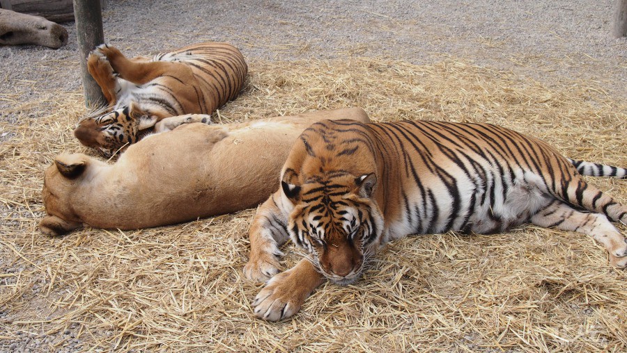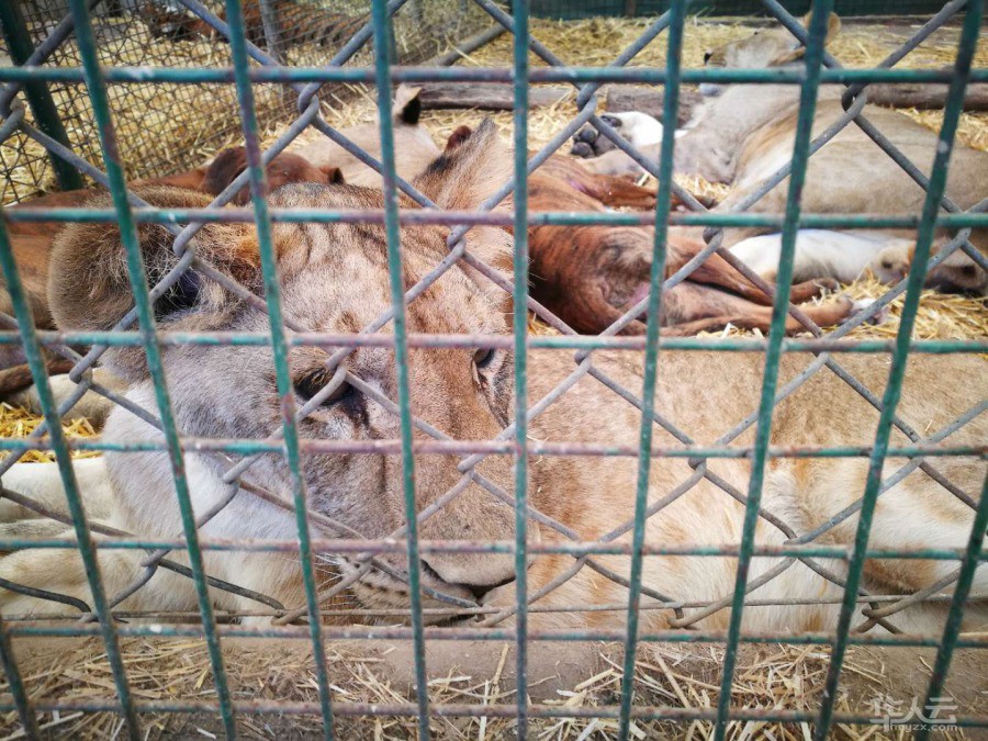 老虎园里,老虎一般都是在睡觉,一个笼子里一般四五只居多,也都没有任何保护措施。