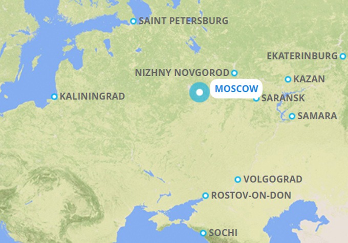 本届世界杯的赛事分布在俄罗斯的11个城市举办,分别是圣彼得堡Saint Petersburg、叶卡捷琳堡Ekaterinburg、下诺夫哥罗德Nizhny Novgorod、喀山Kazan、加里宁格勒Kaliningrad、莫斯科Moscow、萨兰斯克Saransk、萨马拉Samara、伏尔加格勒Volgograd、罗斯托夫Rostov-on-don和索契Sochi。
