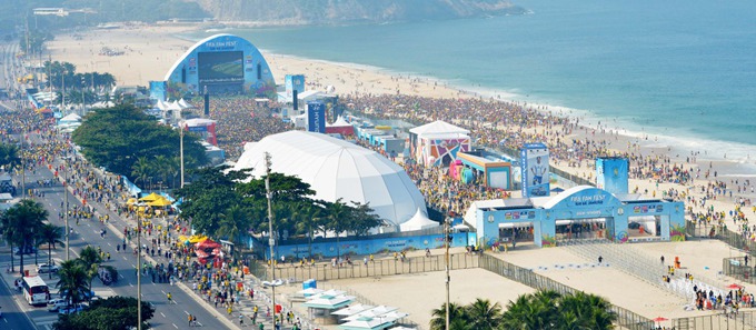 2014年巴西世界杯的时候,同样是12个举办城市12处球迷狂欢乐园,其中最地标的科帕卡巴那海滩的Fan Fest场面,足以看出球迷乐园的热闹程度,比赛期间每天都有14个小时的娱乐项目,白天在沙滩游玩,晚上看比赛,夜里变身沙滩派对可以尽情热舞,和在体育场里看完一场比赛是截然不同的体验。