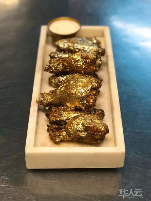 将腌制12小时的鸡翅裹上24克拉的金液和金粉,放入炉中烤至酥脆,再配上一瓶Jay-Z专属的黑桃A香槟,这一餐下来大约要1000美元。当然鸡翅也可以单点,10个45美元。