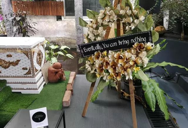 怀着打卡网红店的心情进入这家咖啡店,却看到花圈、棺材、骷髅这些象征死亡的物件散落在角角落落,一瞬间以为自己错入了葬礼现场。原来这是家以死亡为主题的咖啡店,不仅装饰,甚至连咖啡饮品的名字都与死亡有关:Espresso叫做Last Day,Americano 叫One Week Left。