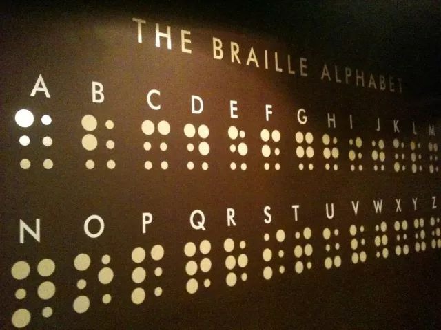 餐厅位于地下,下了层层楼梯走过长廊推开木门,来到餐厅的酒吧台。因为用餐区是完全黑暗的,所以这里也是客人点餐的地方。墙壁两侧的盲文字母和英文标语让你做足了心理准备,迎接只专注于味觉的一餐。