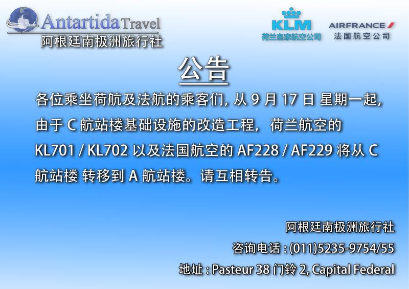 9月17日起Ezeiza机场C航站楼进行基础设施的改造,原先停靠C航站楼的荷兰航空KL701/KL702以及法国航空的AF288/AF299航班将转移至A航站楼。请互相转告。