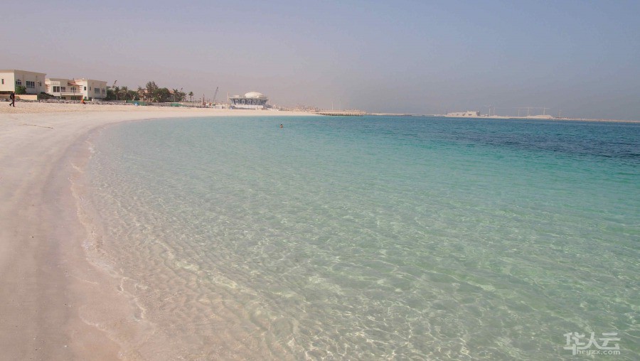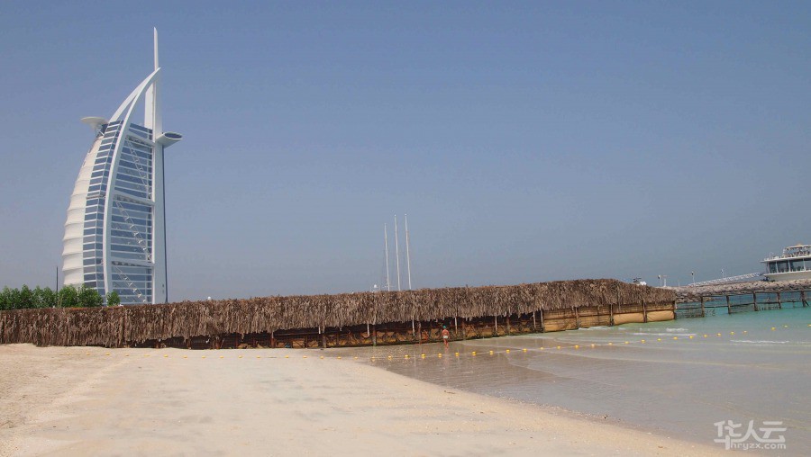 由于酷热难耐,等公交往往会变得惨不忍睹,在这样的环境下,交通方式为打车还是不错的选择。打车前往朱美拉公共海滩Jumeirah Public Beach。无需寻找,漫无边际的海岸线就展现在眼前。白色的细沙一望无际,绵软至极,踩上去舒服极了。蜿蜒的沙滩将波斯湾的海水揽入怀中。海水清澈,一直到远眺之处都能见底,这里的海水是绿色的、透明的,如翡翠一般。沙滩远处便是大名鼎鼎的帆船酒店了,那是奢华的象征。在公共浴场的范围内有可以租界沙滩椅的地方,但是由于酷热难耐,连钟爱日光浴的西方人也并不选择在这里暴晒。