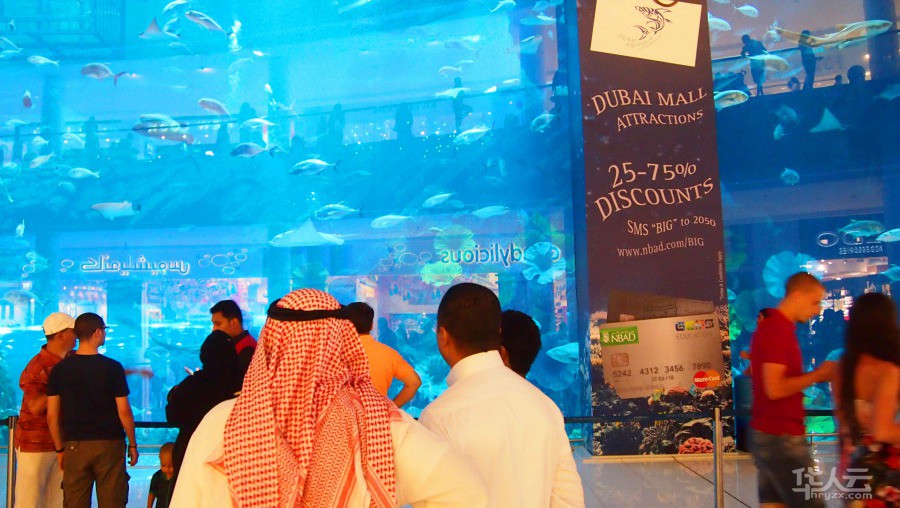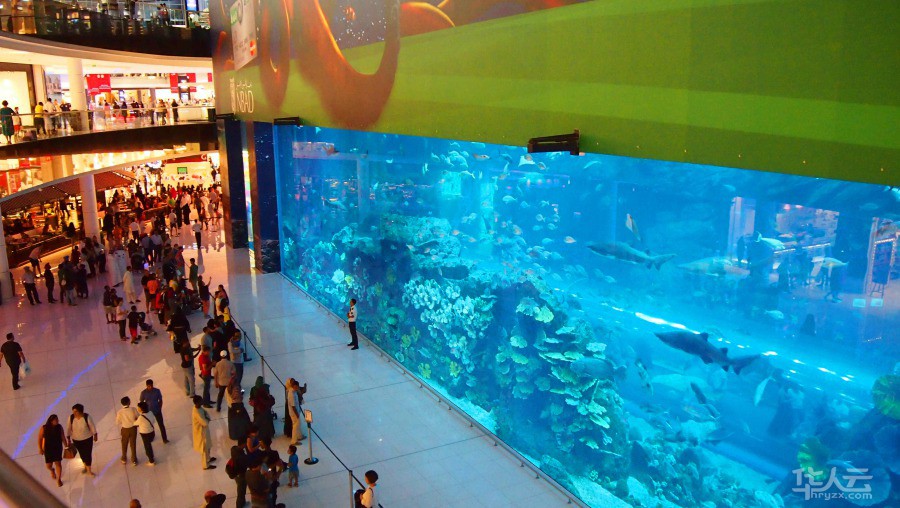 商场内的LV、GUCCI等品牌的最新款几乎都被当地的阿拉伯女人提前预定了,虽然身着黑袍,但是黑袍下极尽奢华,就连看似普通的黑袍都是价格不菲。他们的美丽全部被掩盖,而唯一能欣赏这神秘之美的只有他们的丈夫。著名的迪拜水族馆Dubai Aquarium也在购物中心内,这里拥有世界上最大的水族箱。一进入购物中心便能看到购物中心中厅有着一座非常巨大的蓝色水族箱幕墙,作为世界上最大的水族馆,已被列入了吉尼斯世界纪录。