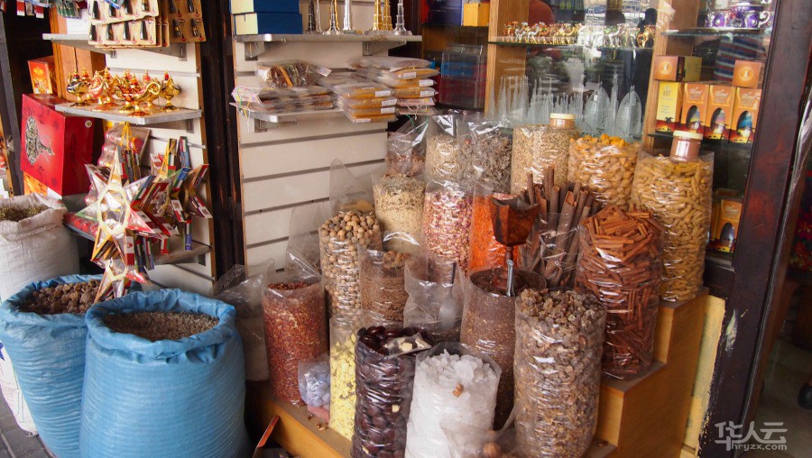 下船走不远便可以看到人流窜动,商店聚集的香料市场。各式香料五花八门,色彩不一,大多数是叫不上名字的。黄金市场与香料市场毗邻,大的商店汇集在一条带棚顶的道路中。